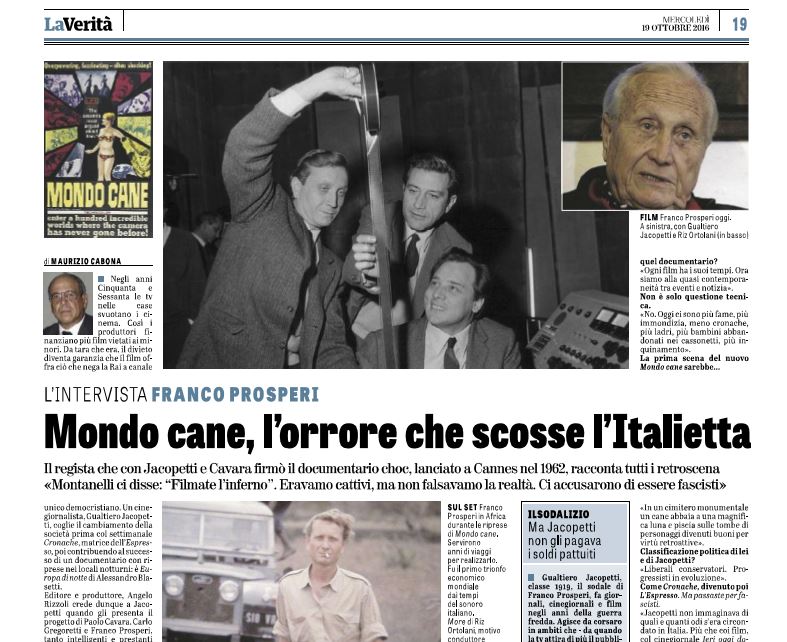 Oggi sul quotidiano La Verità di Maurizio Belpietro, un ampio articolo su Gualtiero Jacopetti e un’intervista inedita a Franco Prosperi. Ringrazio Maurizio Cabona per la citazione del mio Graffi sul mondo, Edizioni Il Foglio (frutto – credo – di un recente pranzo in quel di Barga, nella lucchesia – durante il Lucca Film Festival -, parlando di Jacopetti, Flaiano e Gian Maria Volonté).