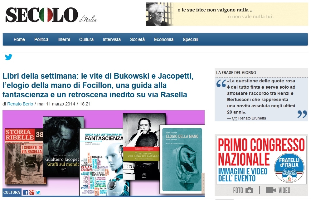 Domenica, 9 marzo, Libero Quotidiano ha dedicato un’ampia pagina a Gualtiero Jacopetti – Graffi sul mondo’. Scrive Giorgio Carbone: ‘Loparco più che un biografo è un appassionato, certosino archivista. Ha recuperato tutto (o quasi tutto) quanto scritto sul personaggio e ha legato i vari capitoli con buona prosa. Lasciando ai lettori non Jacopetti ma un bel pò di strumenti per capirlo’.